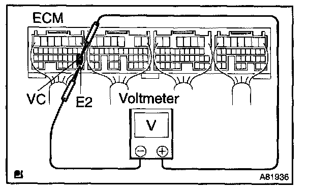2. Using a voltmeter, measure the voltage between connector terminals VC and E2 of the wiring harness side.