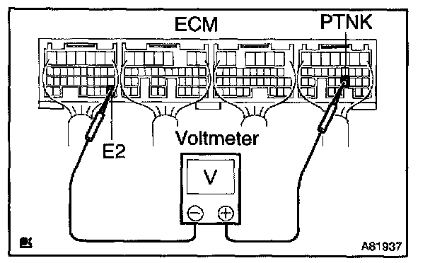 3. Using a voltmeter, measure the voltage between connector terminals PTNK and E2 of the wiring harness side.
