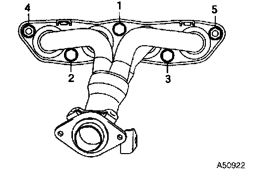 a. Using several steps, install a new exhaust manifold gasket and exhaust manifold with the 3 bolts and 2 nuts in the sequence shown in the illustration.