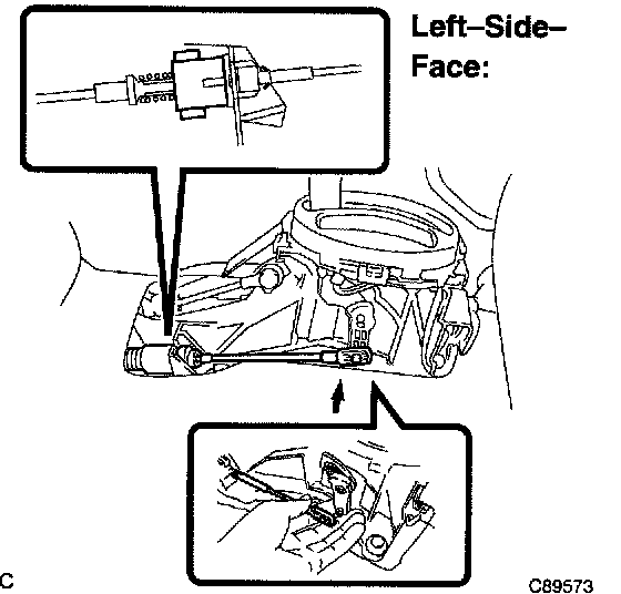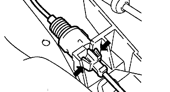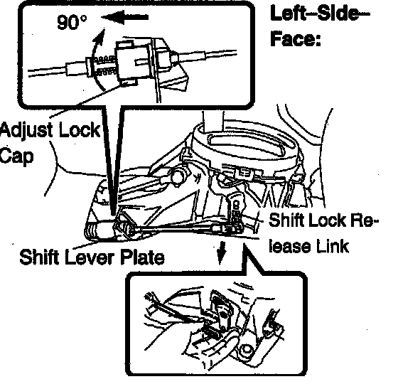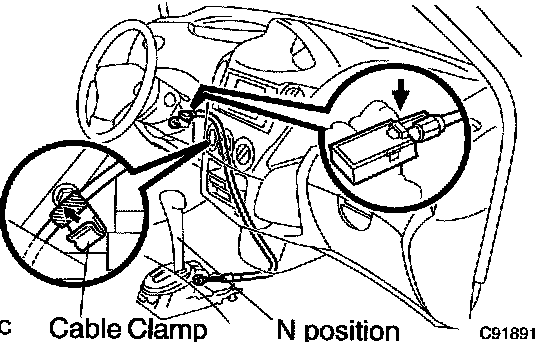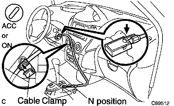 ^ Install the floor shift parking lock cable on the shift lever side with the key in the ACC position.
