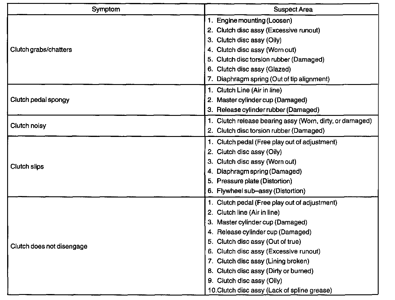 CLUTCH SYSTEM (MTM)PROBLEM SYMPTOMS TABLE