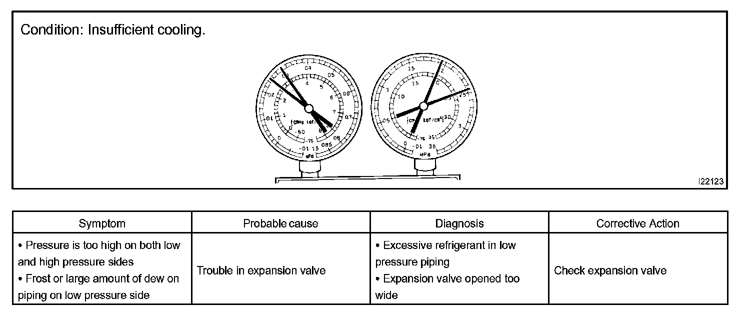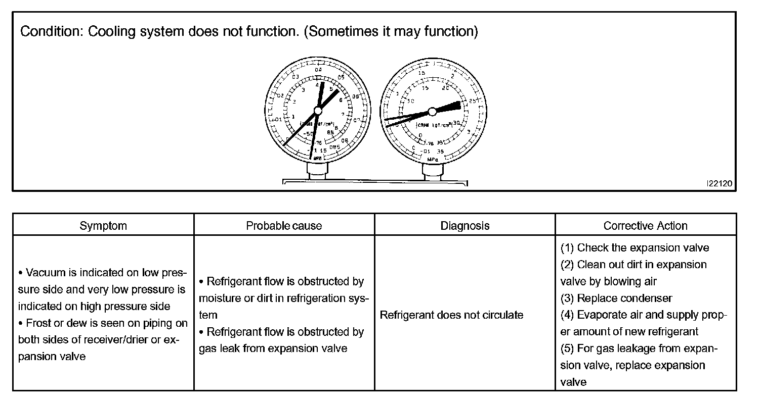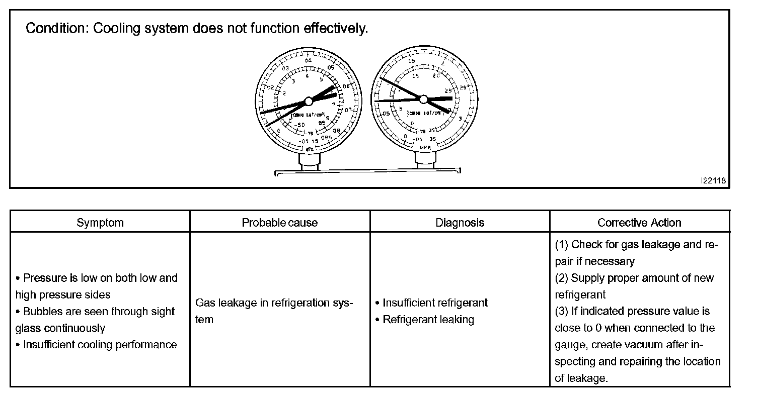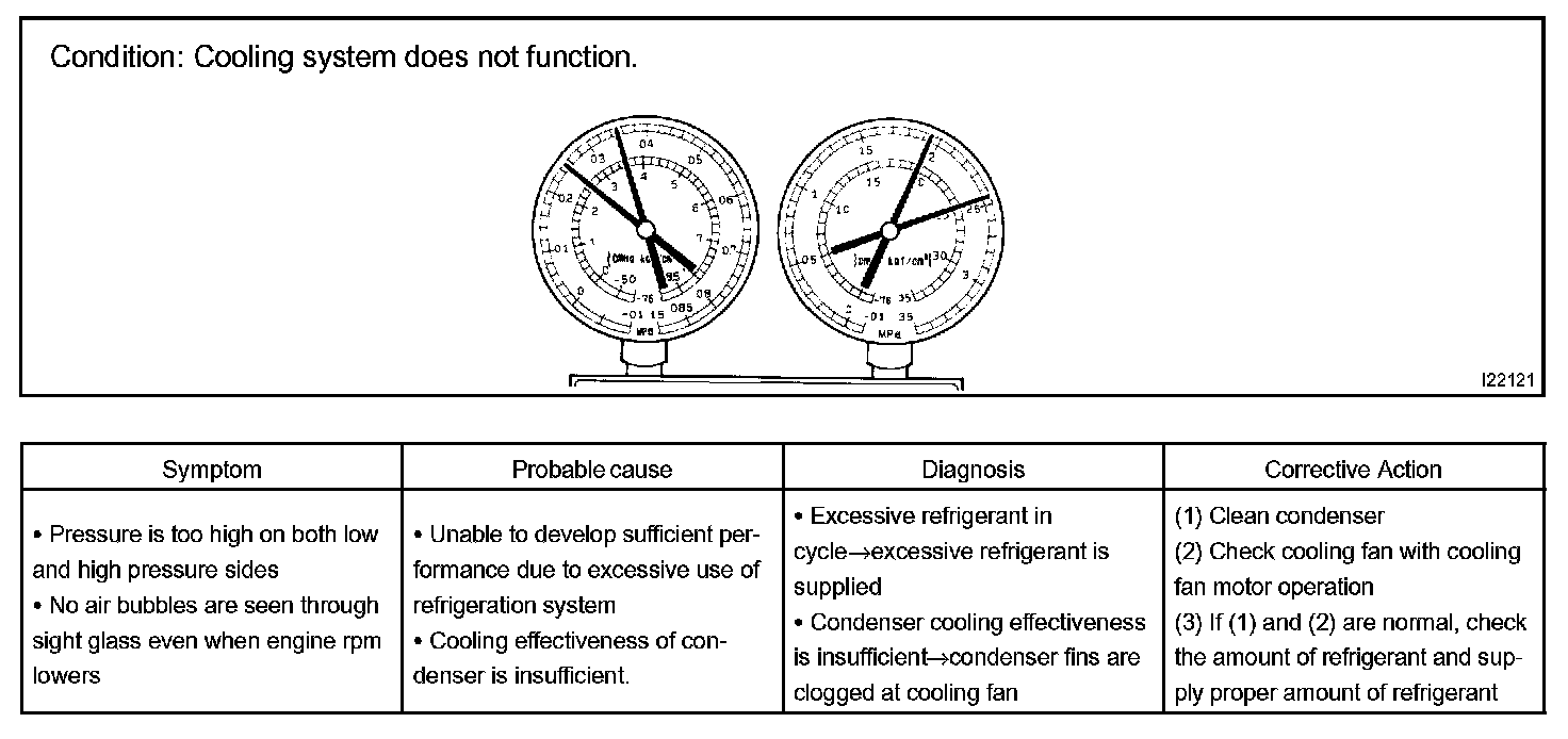 a. This is a method in which the trouble is located by using a manifold gauge set. Read the manifold gauge pressure when these conditions are established.