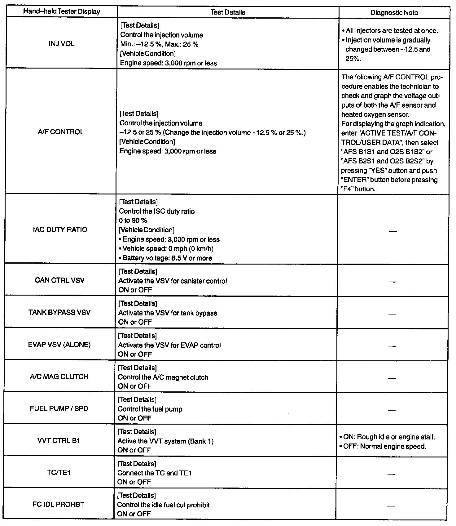 ACTIVE TESTHINT: Performing the ACTIVE TEST using the hand-held tester or the OBD II scan tool allows the relay, VSV, actuator and so on to operate without parts removal. Performing the ACTIVE TEST as a first step of troubleshooting is one method to shorten diagnostic time.