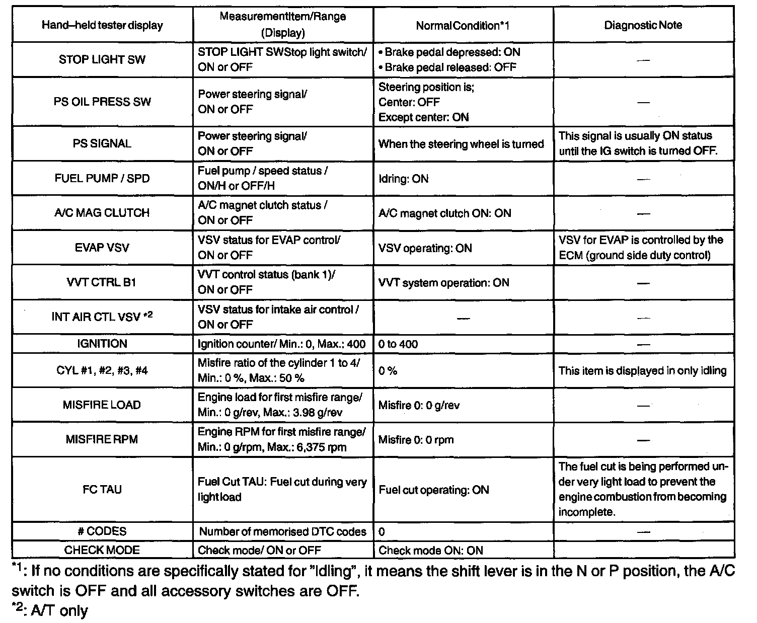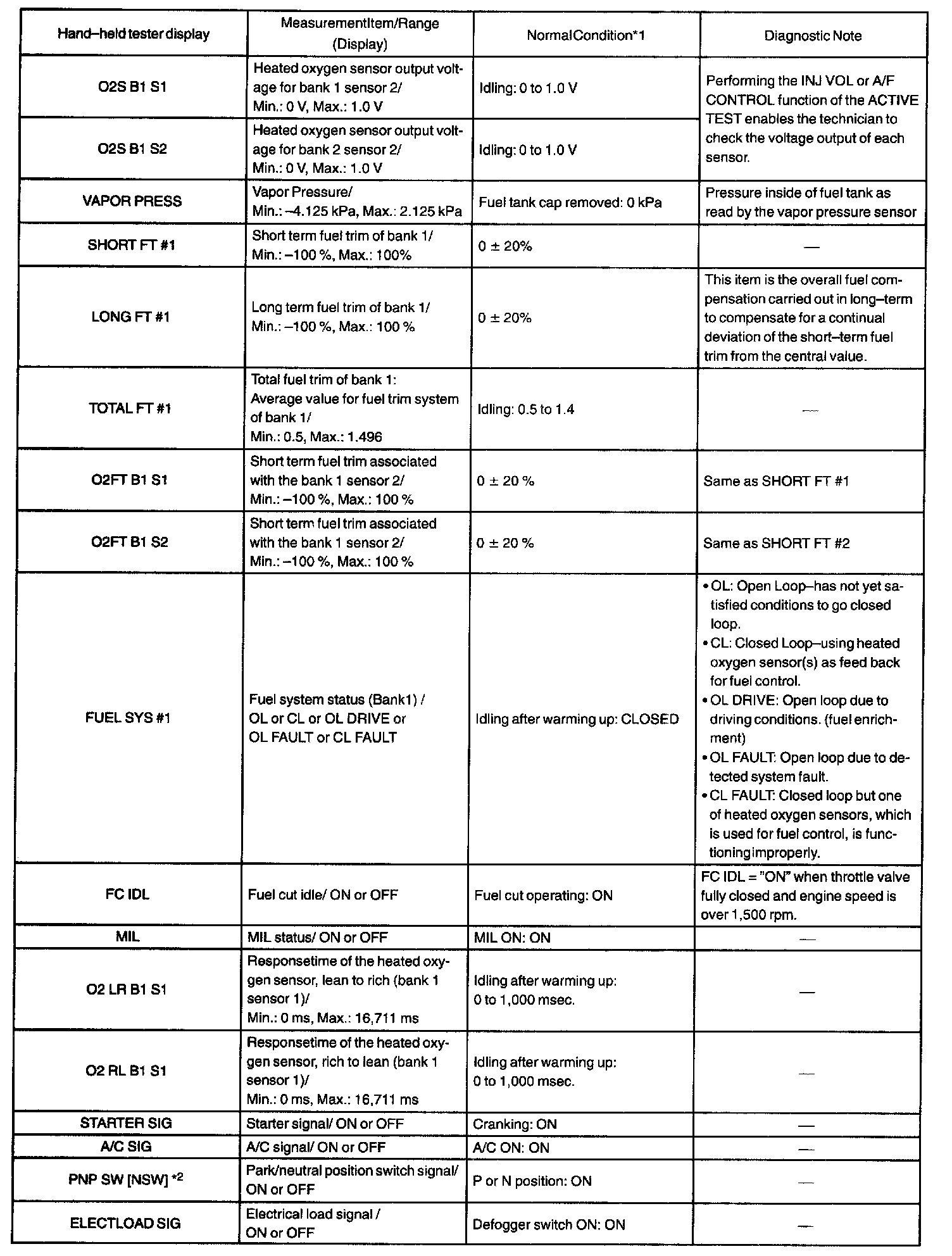 DATA LISTHINT: Using the DATA LIST displayed by the hand-held tester or the OBD II scan tool, you can read the value of the switches, sensors, actuators and so on without parts removal. Reading the DATA LIST as a first step of troubleshooting is one method to shorten diagnostic time.
