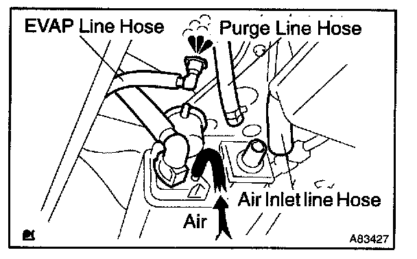 HINT: Check the fuel volume in the fuel tank if there is no ventilation in step (c). If the fuel is full, the EVAP line vent is closed by a float valve of the fill check valve, therefore air cannot pass through the EVAP line hose. Reduce the fuel volume if necessary.