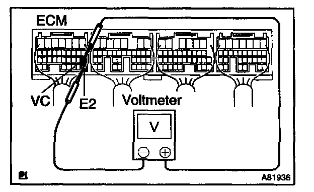 2. Using a voltmeter, measure the voltage between connector terminal VC and E2 of the wiring harness side.