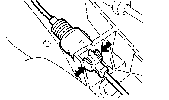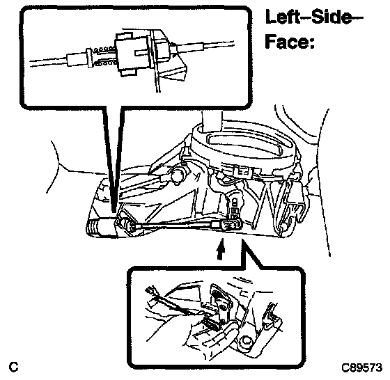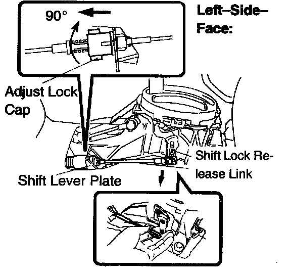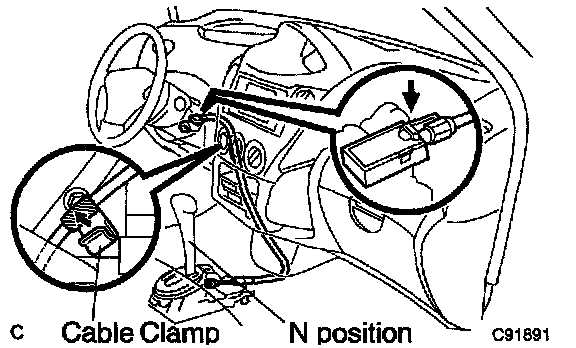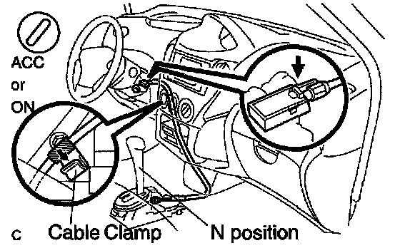^ Install the floor shift parking lock cable on the shift lever side with the key in the ACC position.