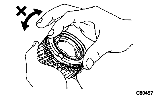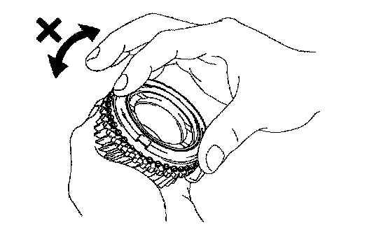 a. Apply gear oil to the cone of the 3rd gear and check with the synchronizer ring No.2 contacted by pressure that the gear does not turn in the direction as shown in the illustration.