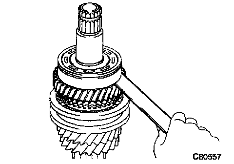 a. Apply gear oil to the cone of the 4th gear and check with the synchronizer ring No.2 contacted by pressure that the gear does not turn in the direction as shown in the illustration.