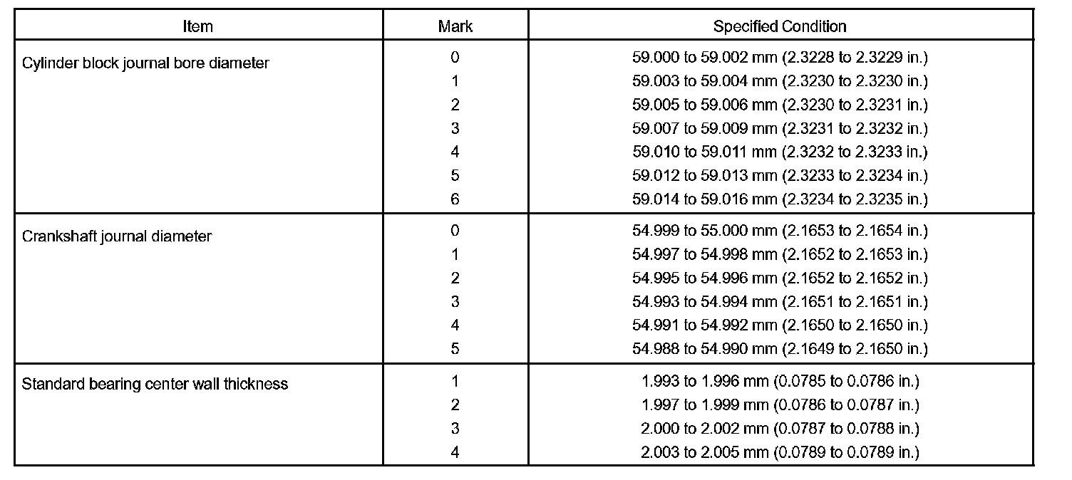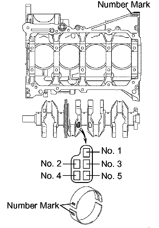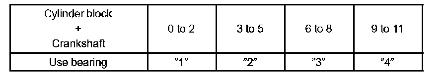 If the number of the bearing cannot be determined, calculate the correct bearing number by adding together the numbers imprinted on the cylinder block and crankshaft, then select a new bearing with the calculated number. There are 4 sizes of standard bearings marked "1", "2", "3" and "4" accordingly.