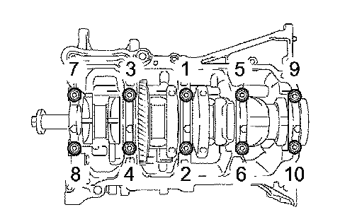 d. Using several steps, uniformly Install and tighten the 10 bearing cap bolts in the sequence shown in the illustration.