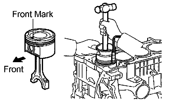 c. Using a piston ring compressor, correctly push the numbered piston and connecting rod assemblies into each cylinder with the front mark of the piston facing forward.