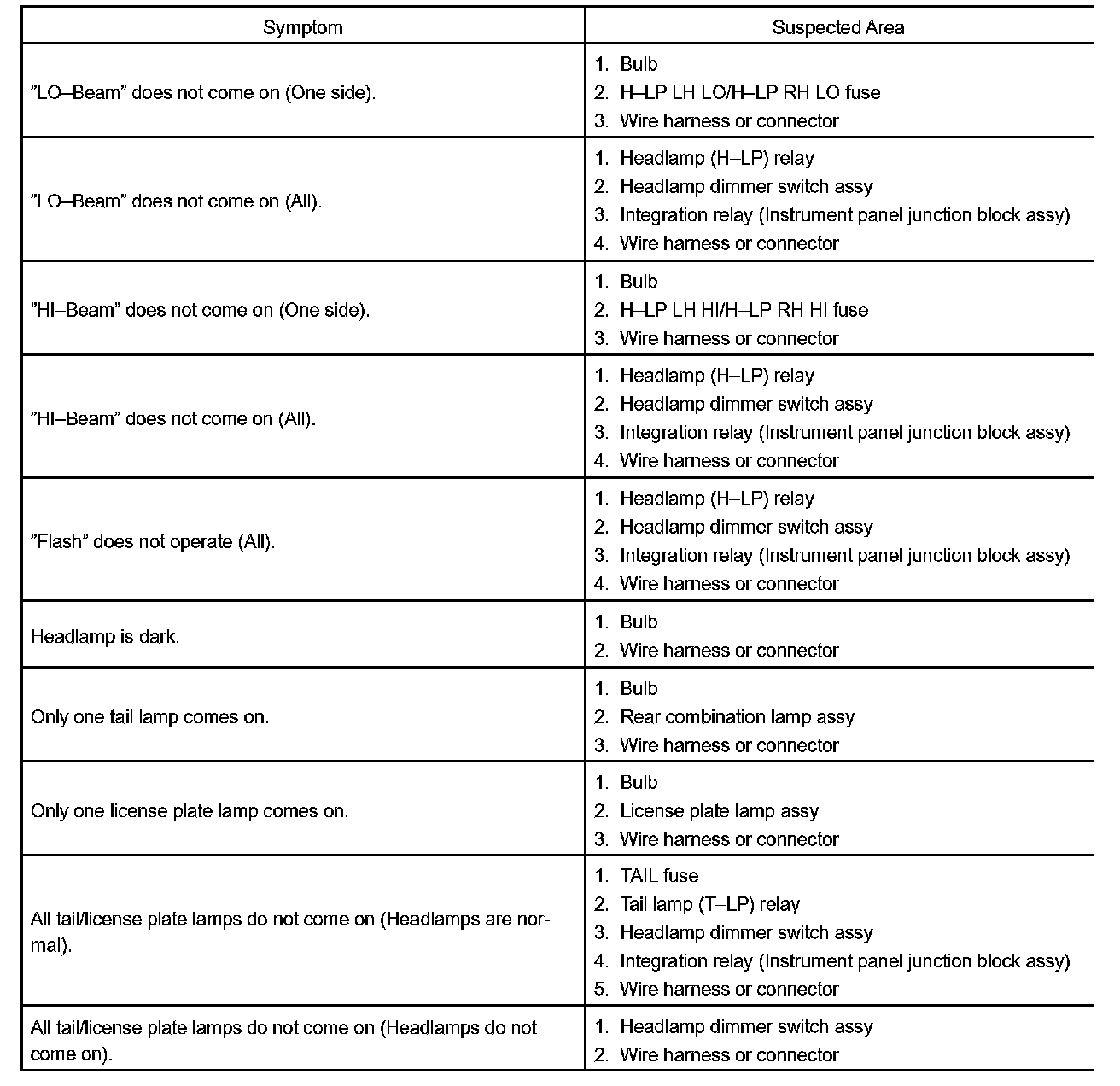 Problem Symptoms Table - Headlamp And Tail Lamp System: