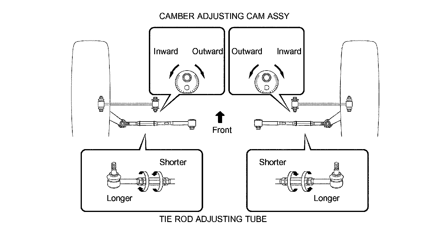 f. Adjust the camber and toe-in by turning the adjusting cam and adjusting tube.