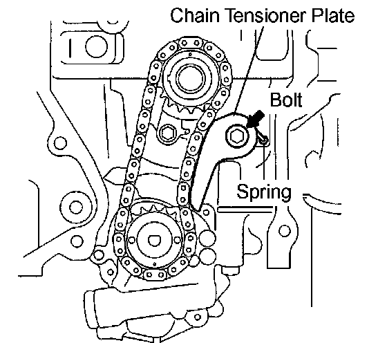 f. Insert the damper spring into the adjusting hole, then install the chain tensioner plate with the bolt.