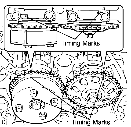 1. Turn the camshafts with a wrench on the hexagonal lobe to align the timing marks of the camshaft timing gear with each timing mark located on the No. 1 and No. 2 bearing caps as shown in the illustration.
