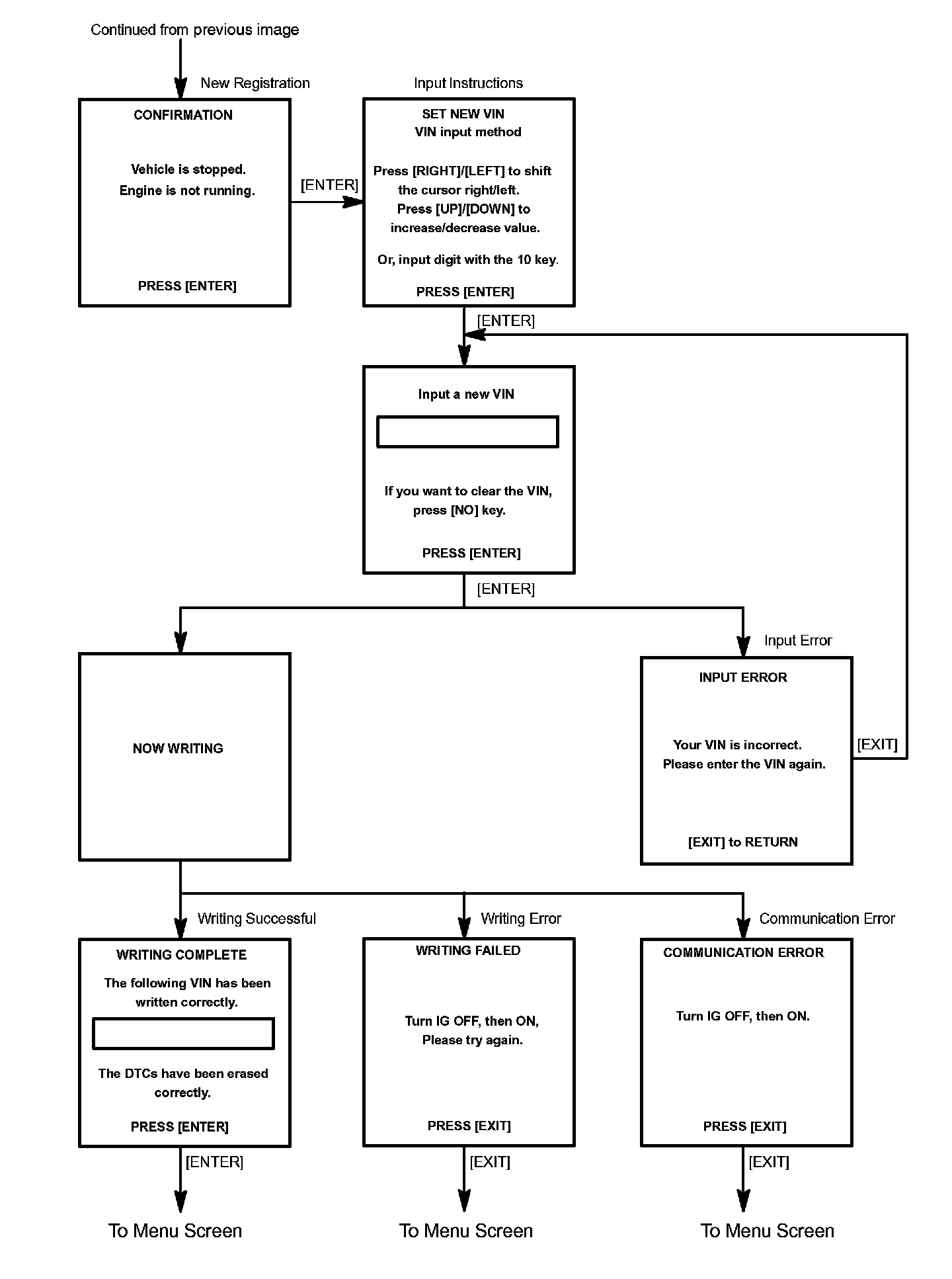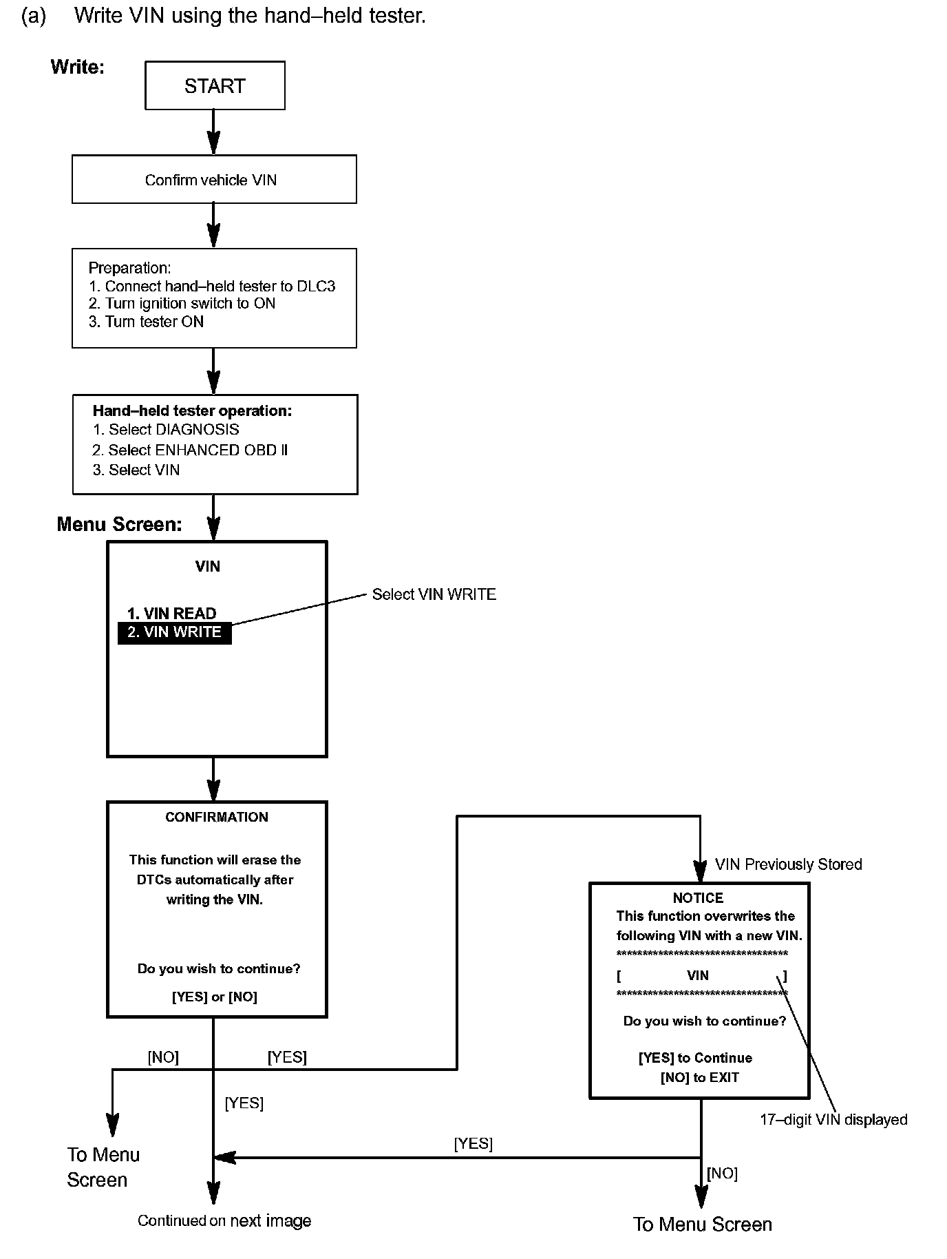 c. Write VIN: Explains the VIN writing process in a flowchart. This process allows the VIN to be input into the ECM. If the ECM is changed, or the VIN and VIN do not match, the VIN can be registered, or overwritten in the ECM by following this procedure.