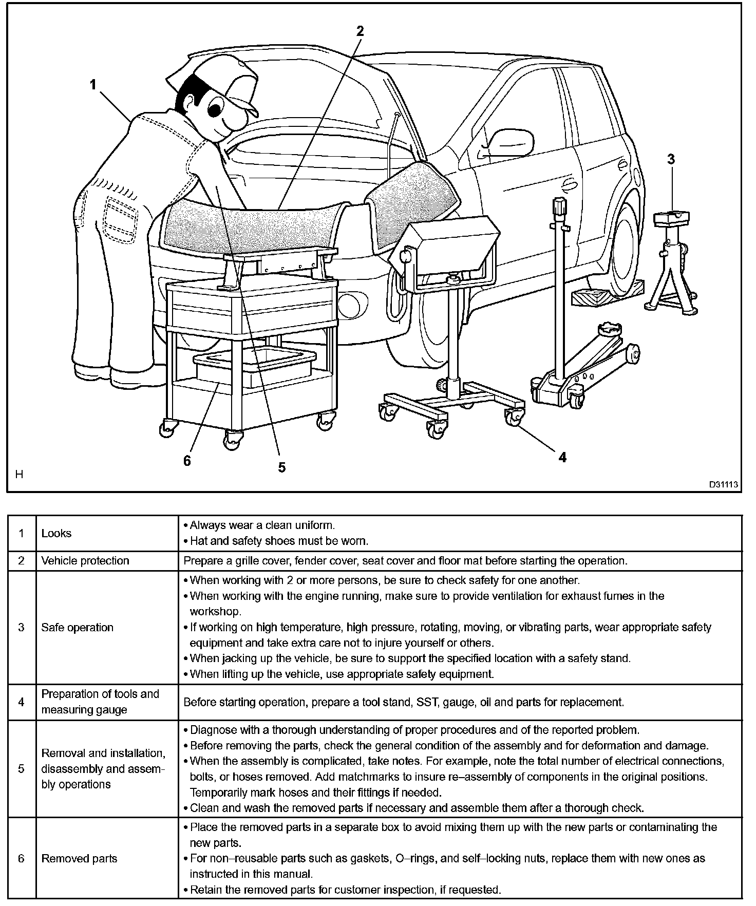 1. Care must be taken when jacking up and supporting the vehicle. Be sure to lift and support the vehicle at the proper locations.