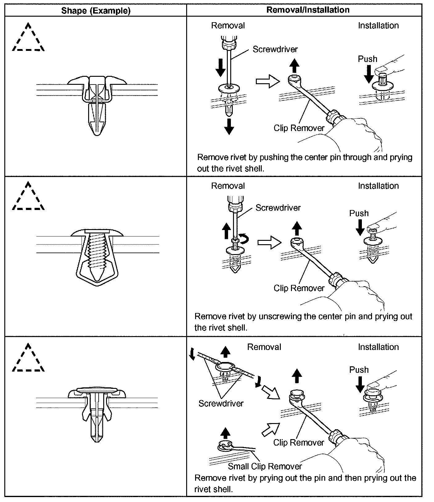 1. The removal and installation methods of typical clips used in body parts are shown in the table.