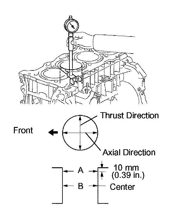 Using a cylinder gauge, measure the cylinder bore diameter at positions A and B in the thrust and axial directions.