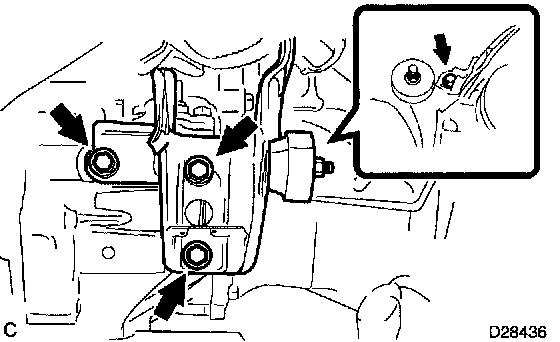 c. Remove the 3 bolts and the engine mounting bracket LH from the manual transaxle.