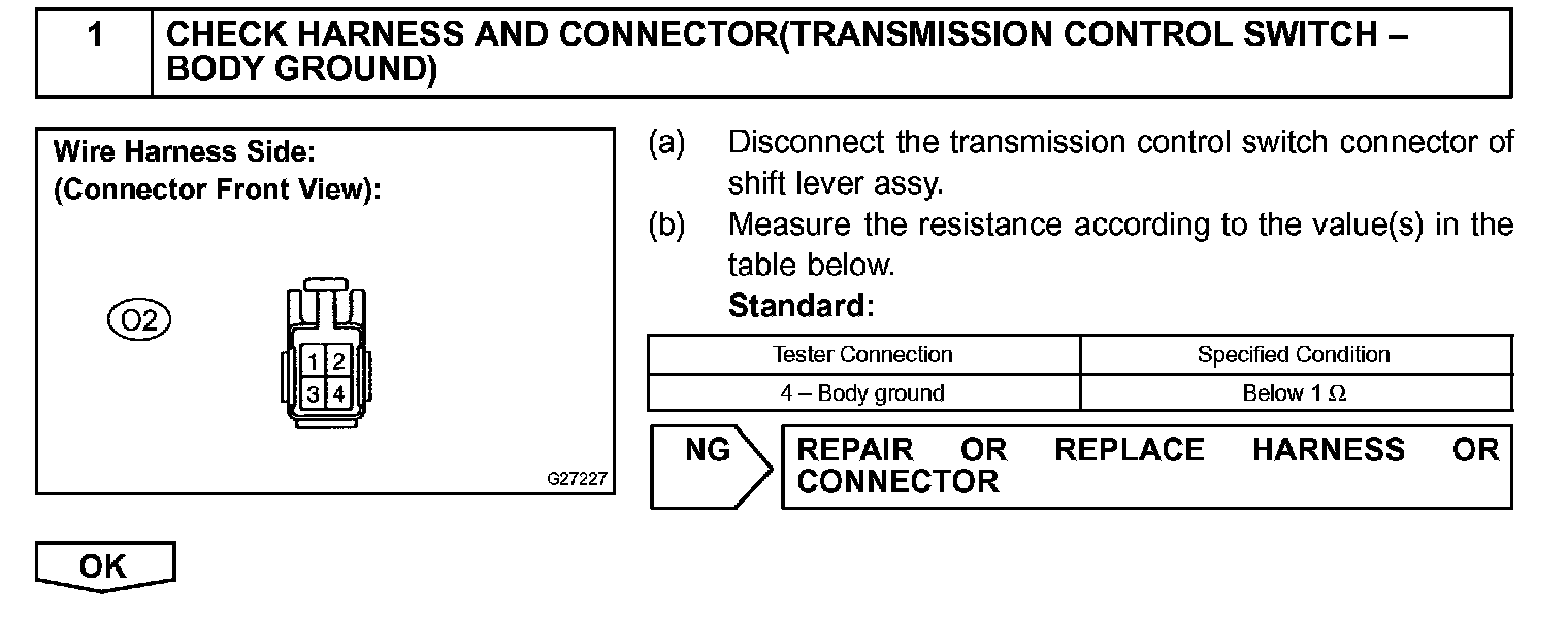 The O/D main switch (transmission control switch) is a momentary type switch. When pressing the O/D main switch, the O/D OFF indicator light lights up and the ECM prohibits shifting into O/D, and when pressing it once again, the O/D OFF indicator light goes off and the ECM allows shifting into O/D. Turning the IG switch OFF will reset the O/D OFF indicator light.