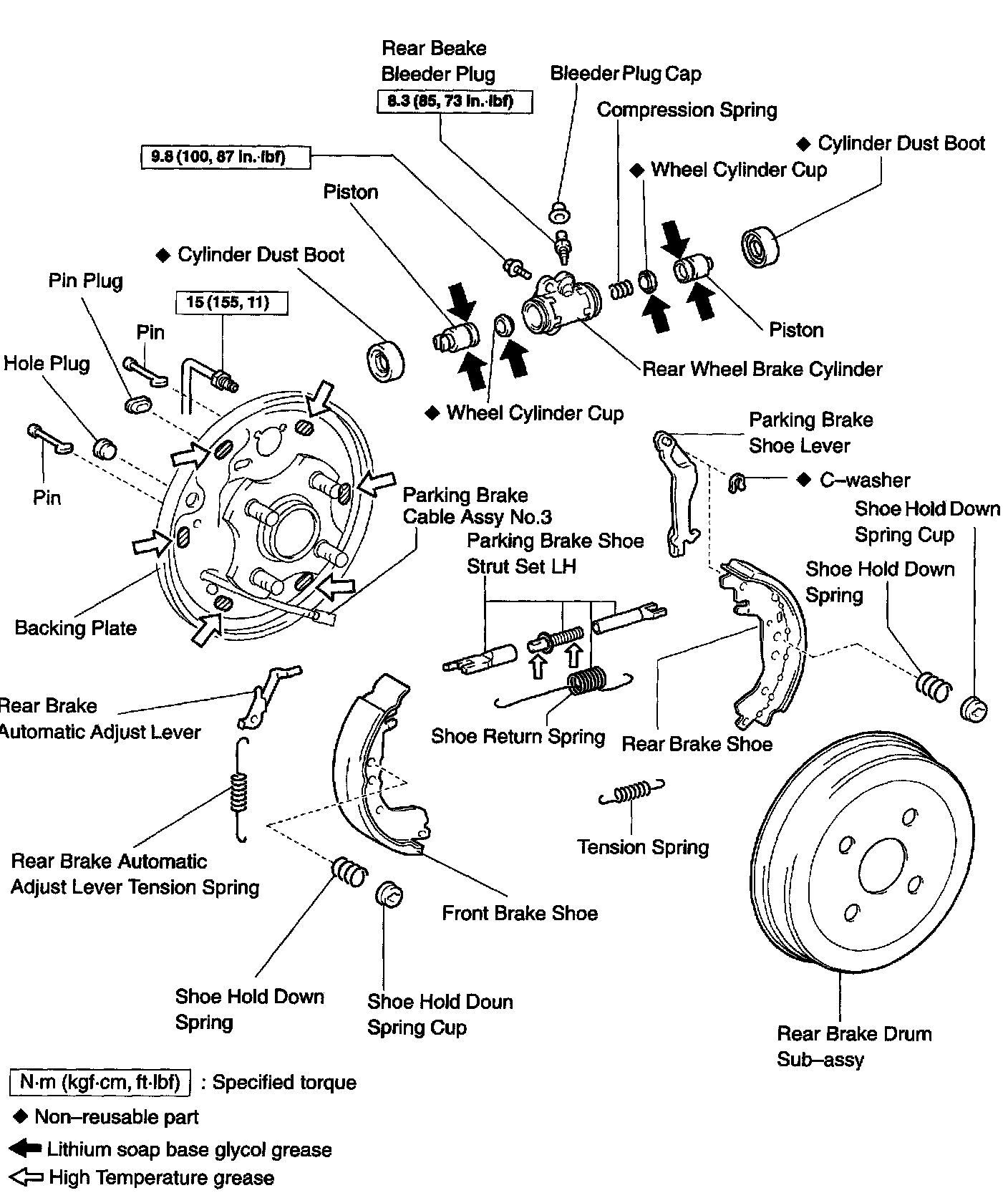 NOTICE: There should be no oil or grease adhering to the friction surfaces of the shoe lining and the drum.