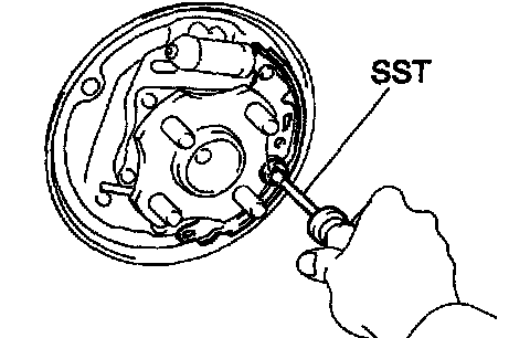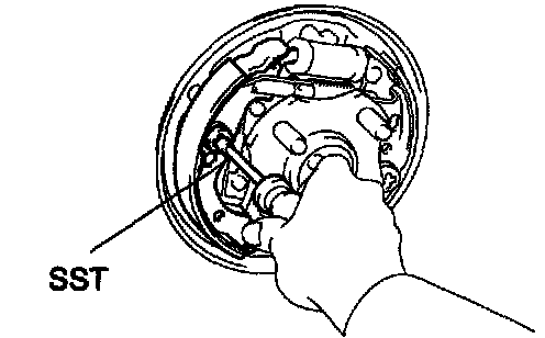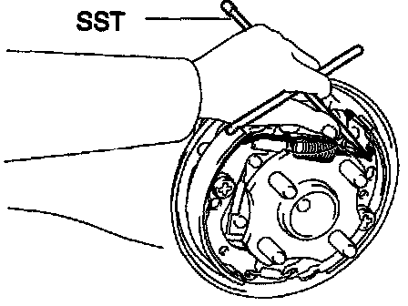 b. Using SST, install the rear brake shoe, the pin, the shoe hold down spring and the shoe hold down cup.