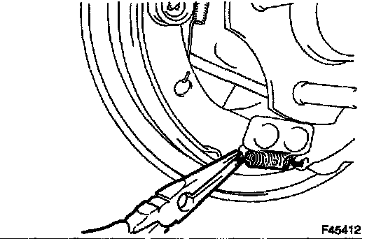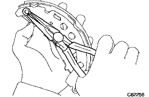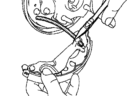 c. Using a needle-nose pliers, connect the tension spring to the front brake shoe and rear brake shoe.