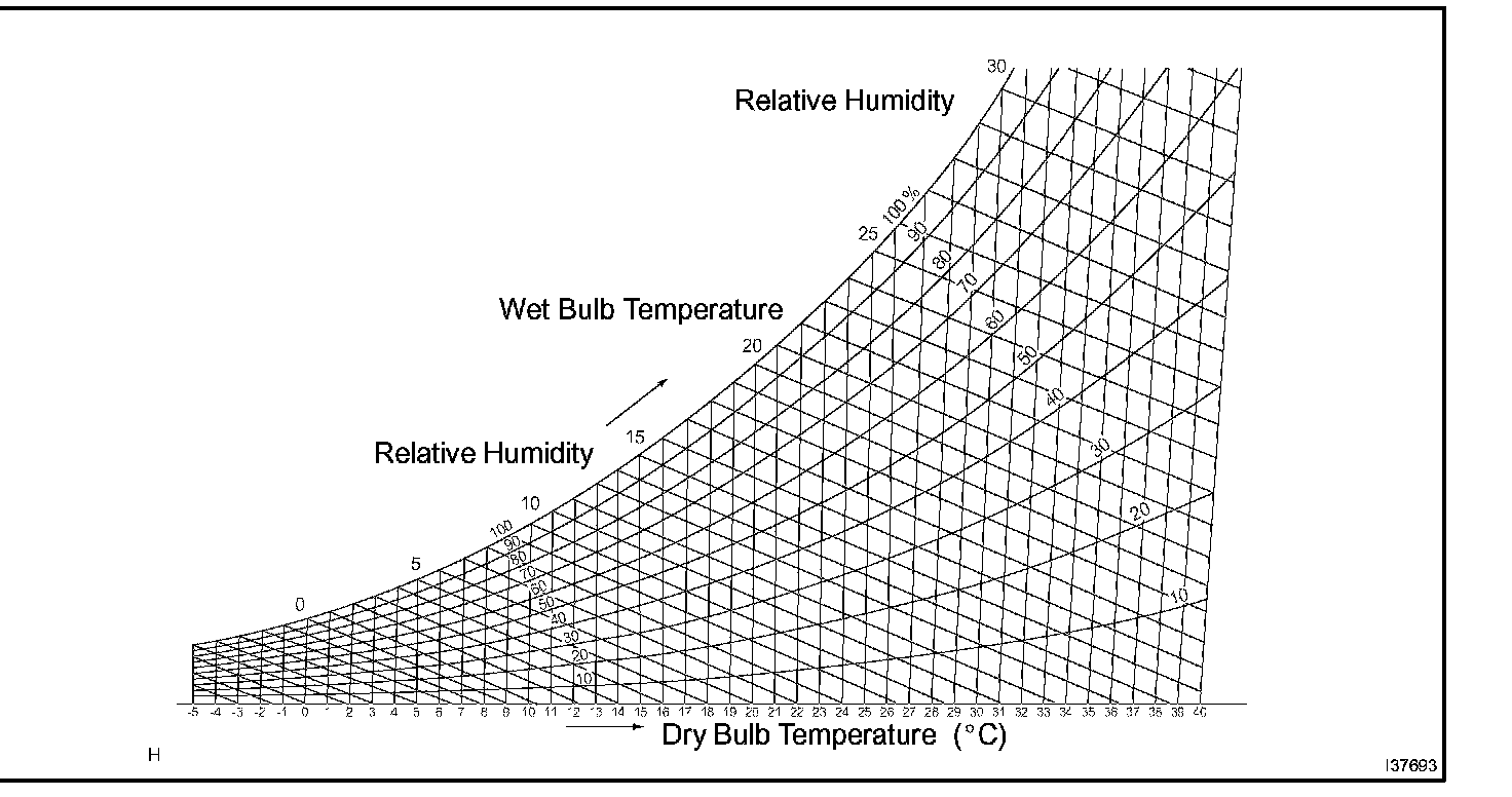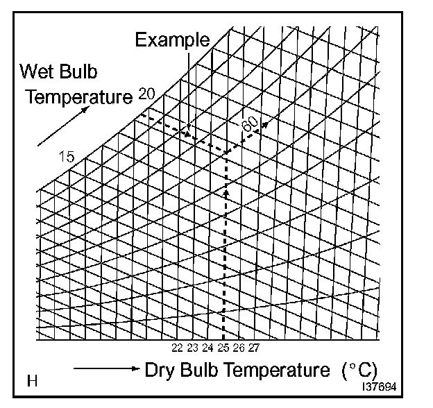 1. For example, when the dry-bulb temperature is 25 degrees Celsius and the wet-bulb temperature is 19.5 degrees Celsius, the relative humidity value is 60%, which is shown in the psychrometric chart as the point where the 2 dotted lines intersect.