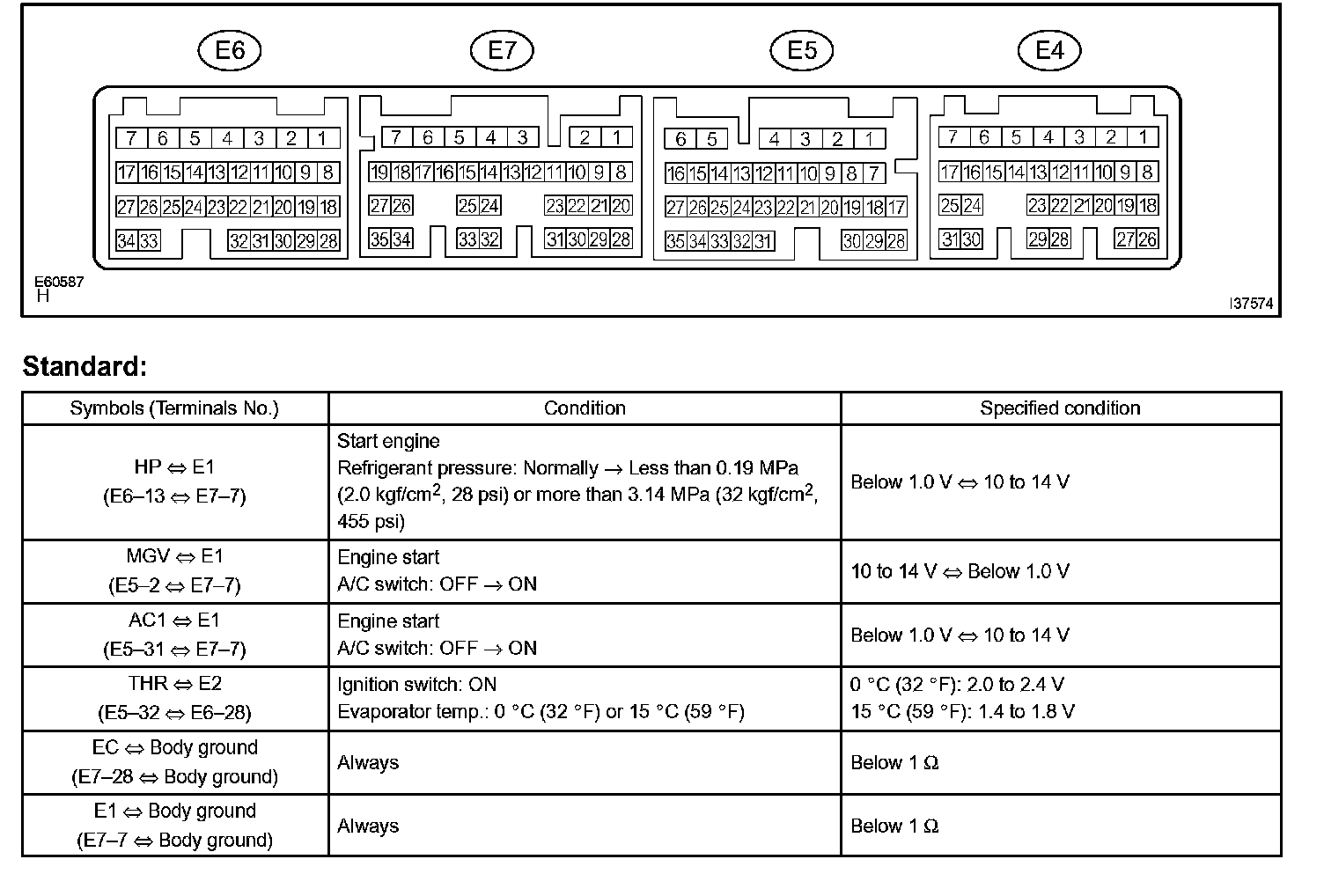 a. Disconnect the connector from A/C amplifier and inspect the wire harness side, as shown in the chart.