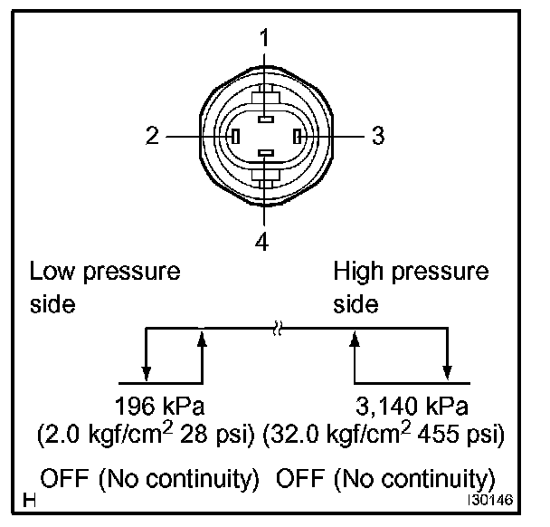 3. Check continuity between the terminals when refrigerant pressure is changed, as shown in the illustration.