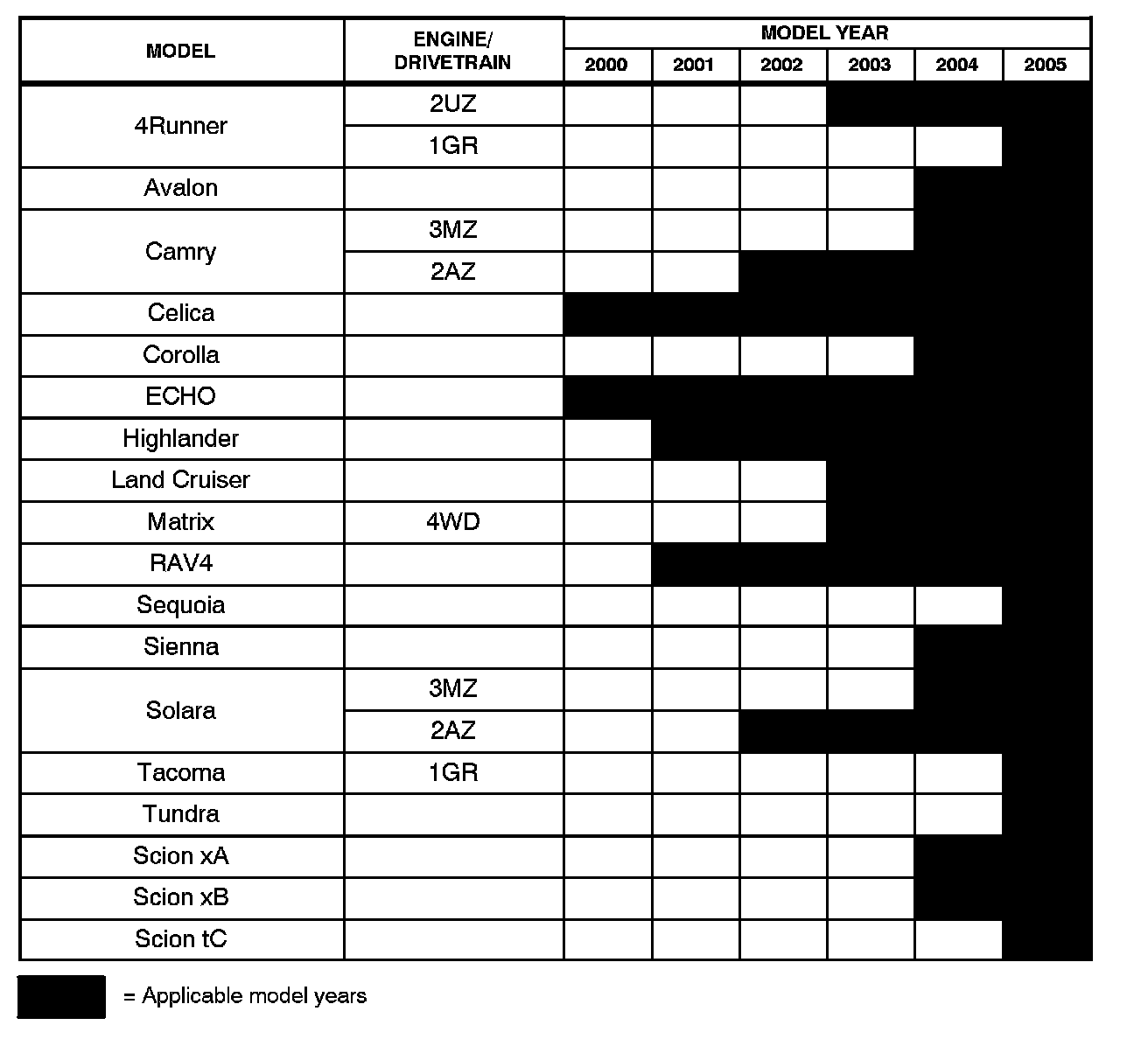 ^ December 20, 2004: Applicable Vehicles section has been updated - Scion vehicles added, 2004 and 2005 model years added, models and model years updated for various models; and Reset Procedure 2 has been revised.