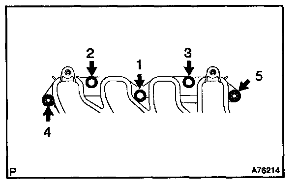 b. Install the intake manifold with the 3 bolts and 2 nuts. Using several steps, tighten the bolts and nuts uniformly in the sequence shown in the illustration.