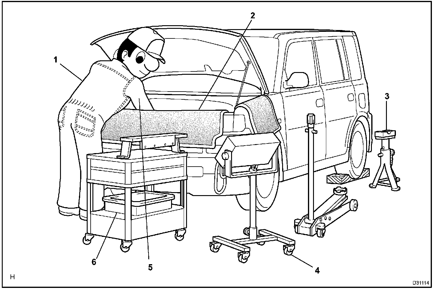 1. Care must be taken when jacking up and supporting the vehicle. Be sure to lift and support the vehicle at the proper locations.