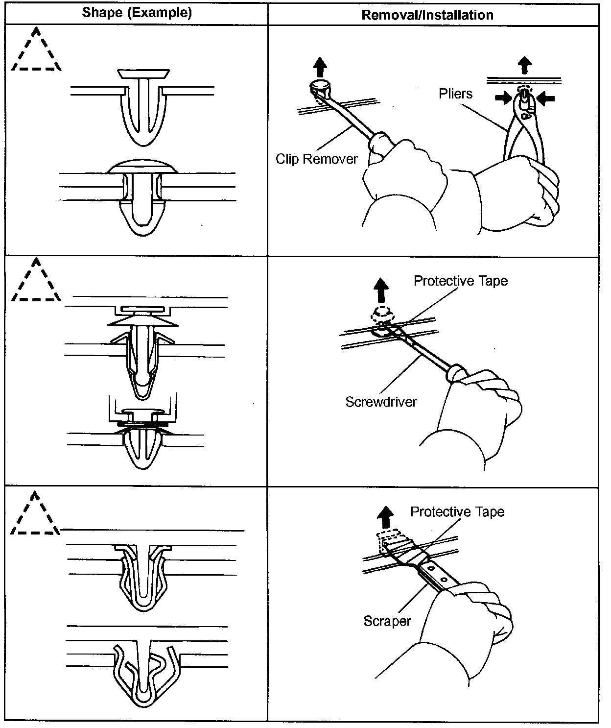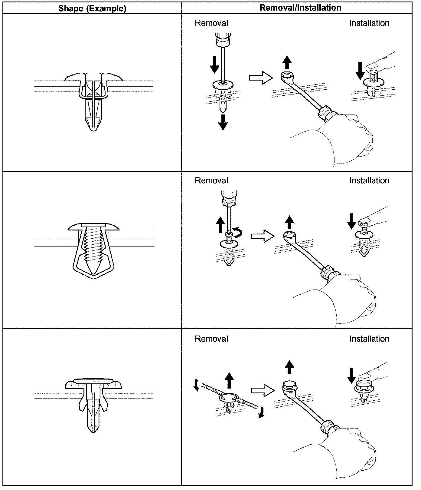 1. The removal and installation methods of typical clips used in body parts are shown in the table.