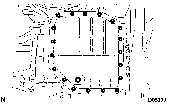 NOTICE: Some fluid will remain in the oil pan. Remove all the oil pan bolts, and carefully remove the off pan sub-assembly. Discard the gasket.