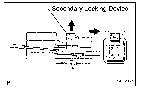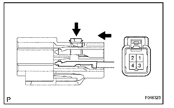 e. Automatic transaxle:Using a screwdriver, disengage the locking lug of terminals 3 and 4, and pull the terminals out from the unlock warning switch assembly connector rear side.