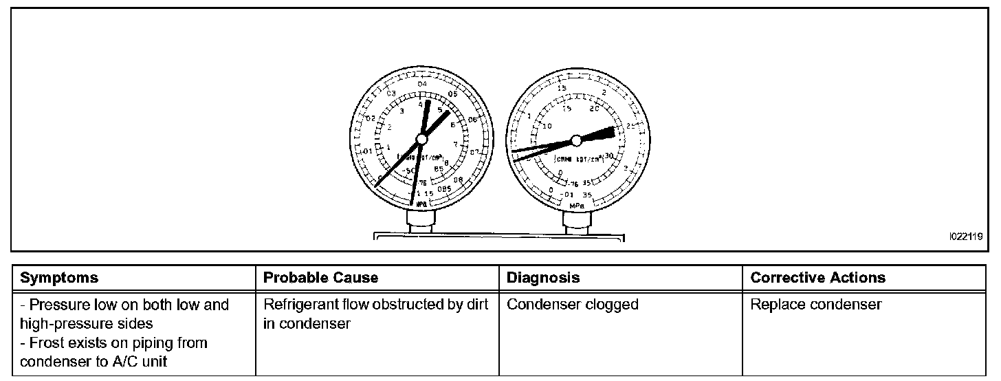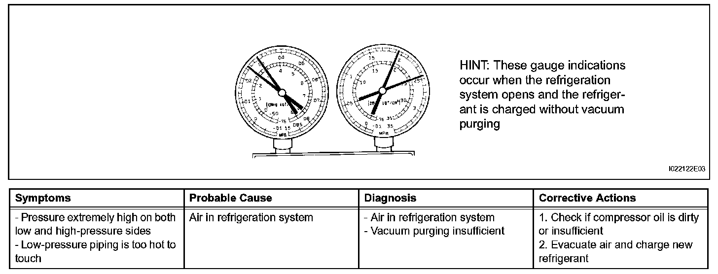 7. The A/C system does not function due to air in the refrigeration system.