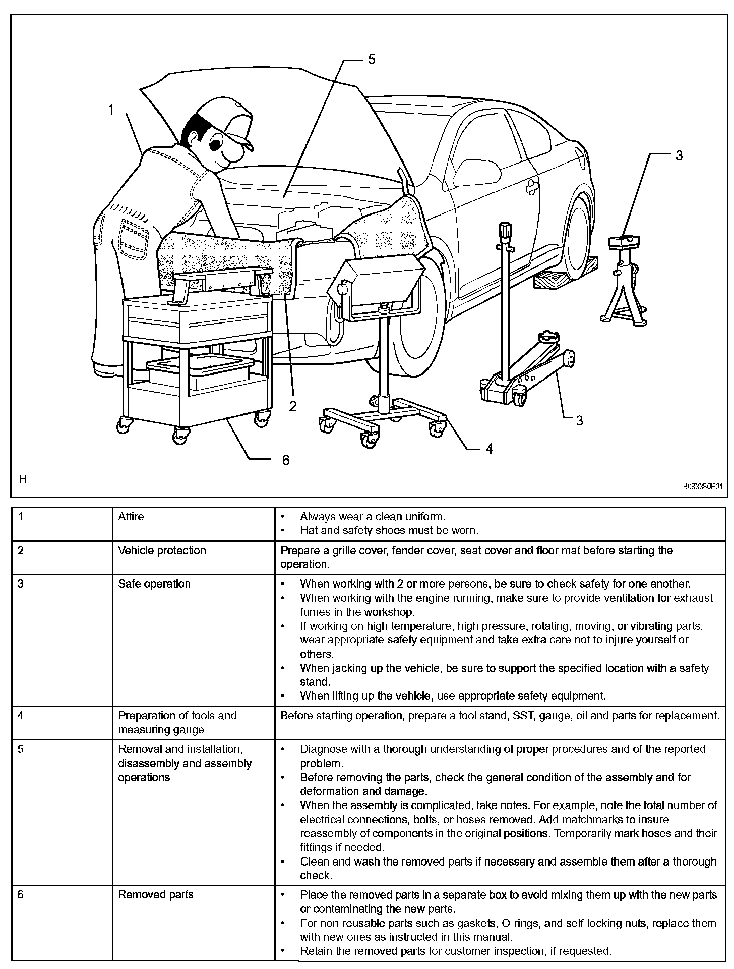 1. Care must be taken when jacking up and supporting the vehicle. Be sure to lift and support the vehicle at the proper locations.