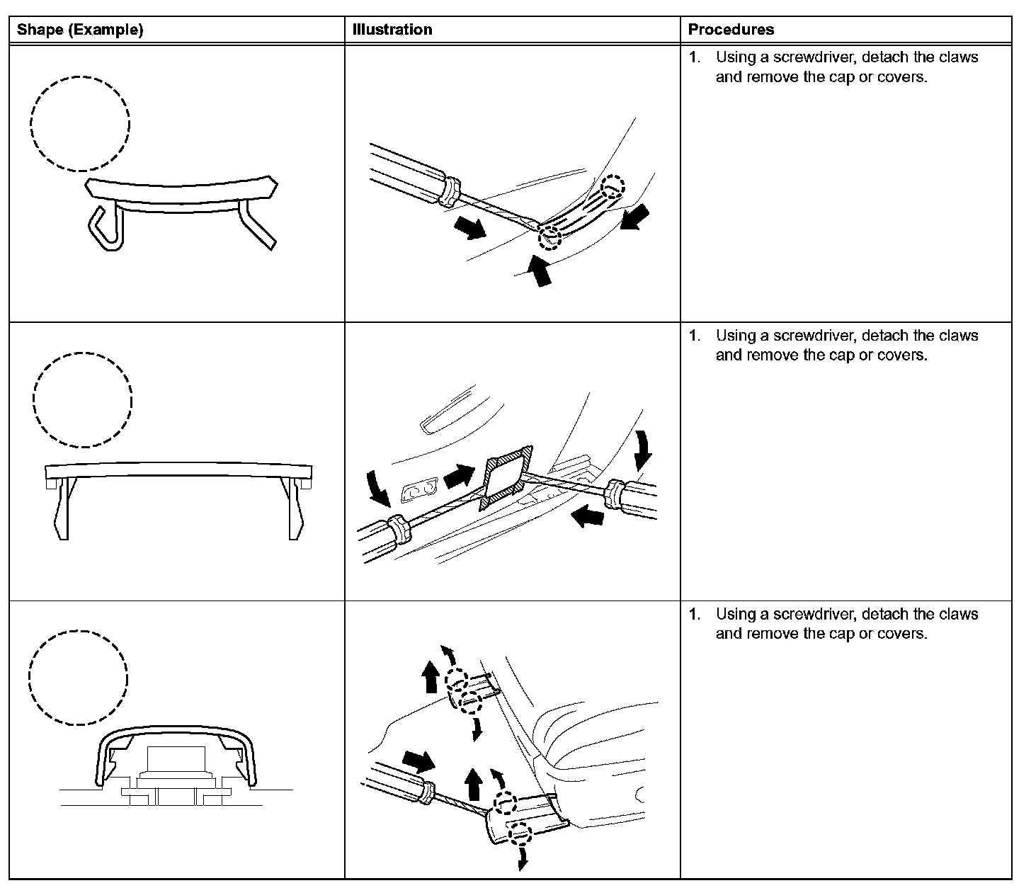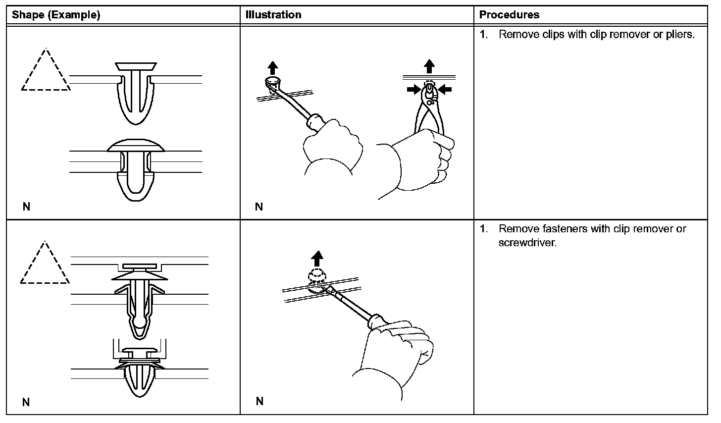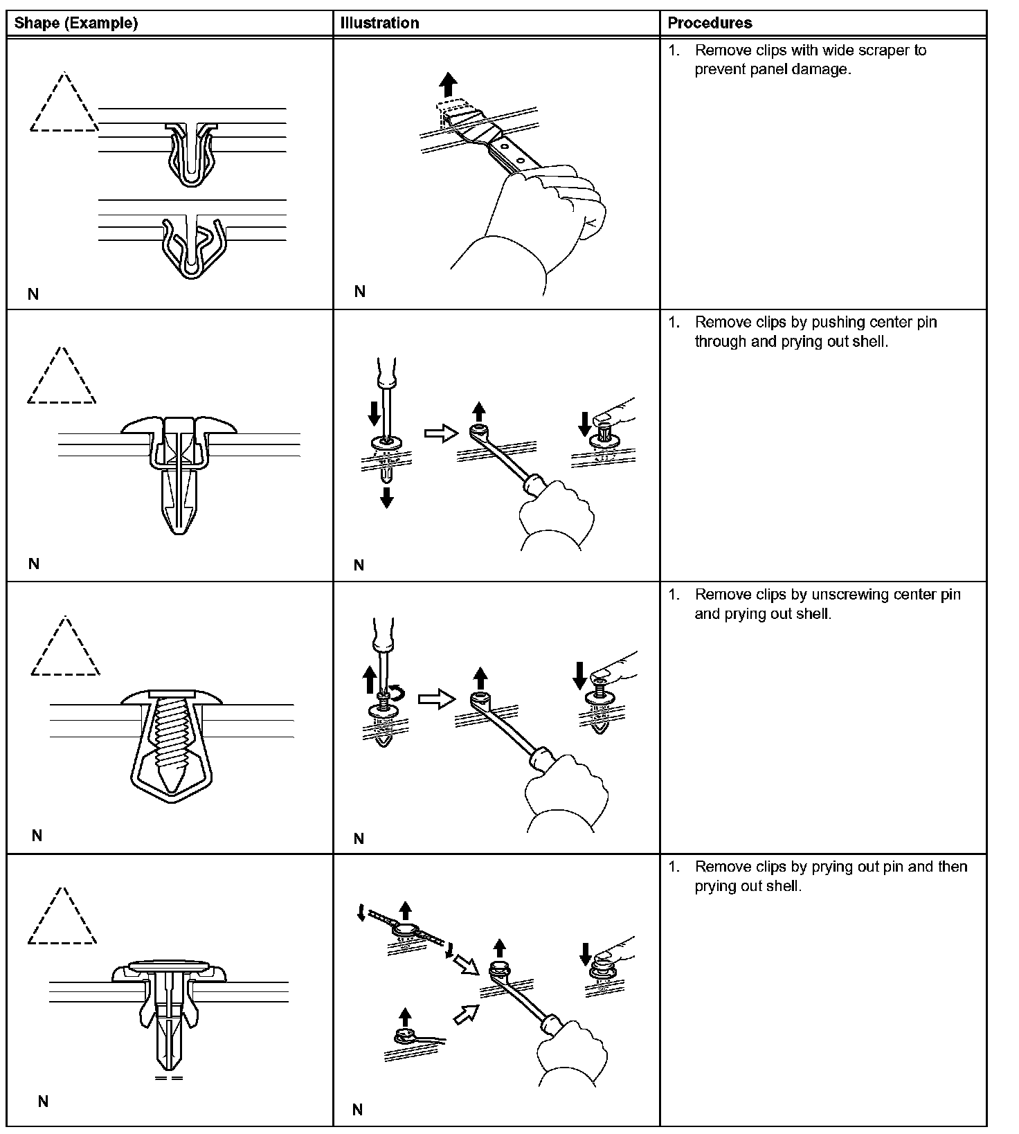 1. The removal and installation methods of typical clips used for vehicle body parts are shown in the table.