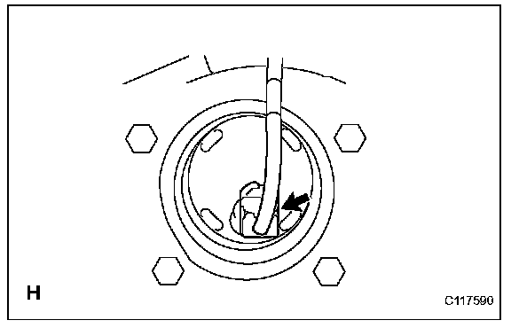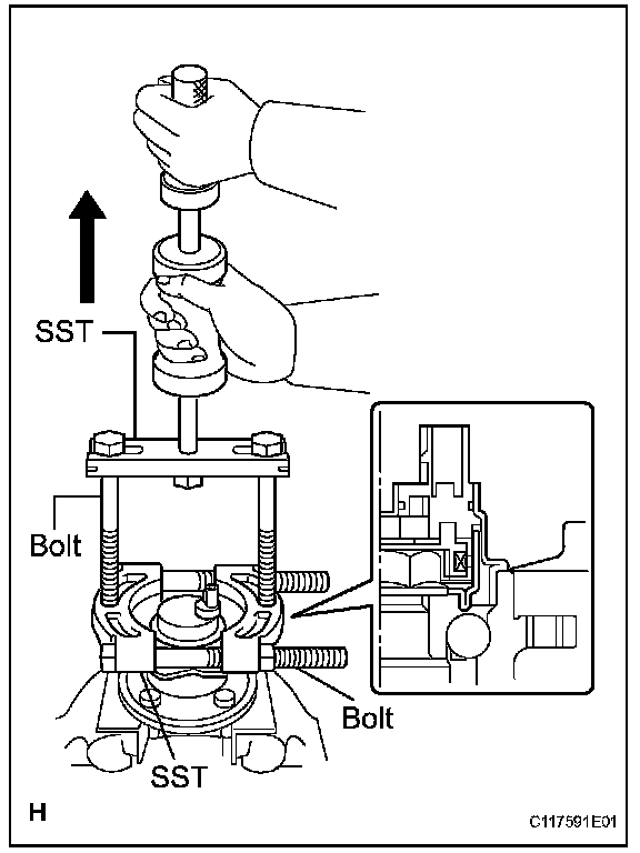 b. Using a pin punch and hammer, drive out the 2 pins of SST, and remove the 2 attachments from SST.