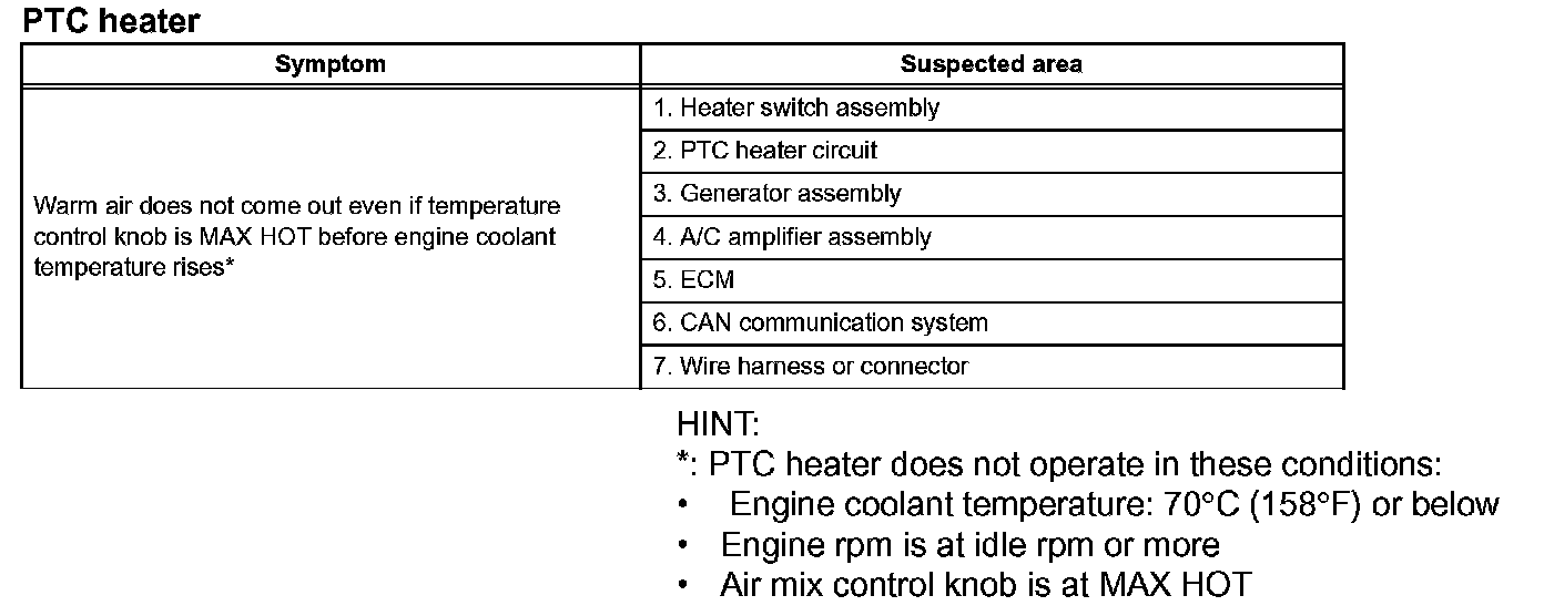 Problem Symptoms Table - PTC Heater:
