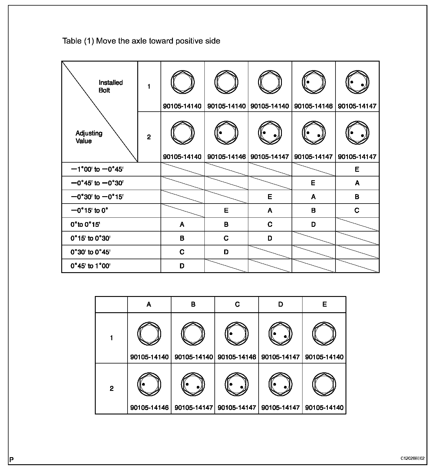 Check installed bolts combination. Select appropriate bolts from the table to adjust the camber to within the specified range.