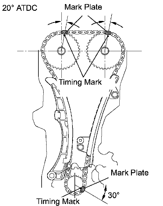 2) Set the cams of the intake and exhaust timing sprockets to 20° ATDC.