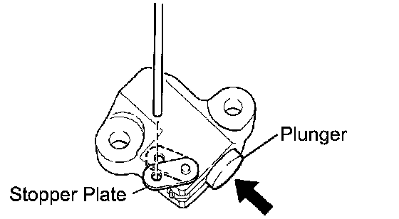 2) While rotating the stopper plate of the tensioner downward, insert a 2.5 mm (0.098 inch) diameter bar into the holes of the stopper plate and the tensioner to hold the stopper plate.