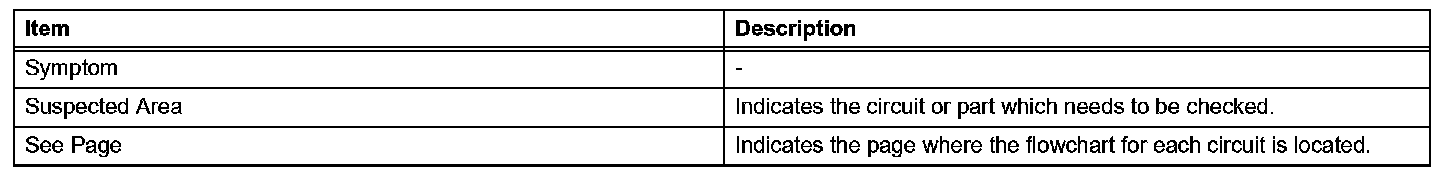 PROBLEM SYMPTOMS TABLEWhen a "Normal" code is output during a DTC check but the problem is still occurring, use the Problem Symptoms Table. The suspected areas (circuits or parts) for each problem symptom are in the table. The suspected areas are listed in order of probability. A description of each of the chart's columns are as mentioned.