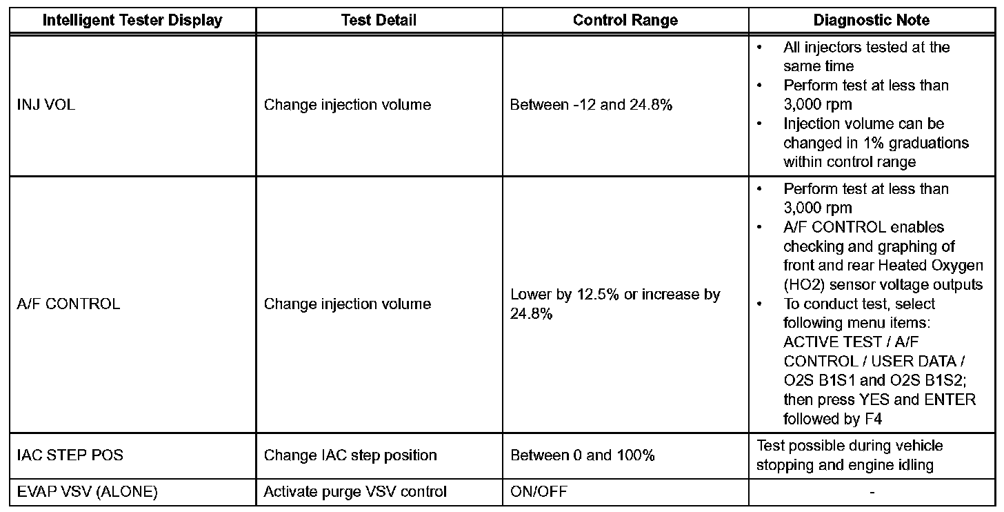 ACTIVE TESTHINT: Performing the intelligent tester's ACTIVE TEST allows relay, Vacuum Switching Valve (VSV), actuator and other items to be operated without removing any parts. Performing the ACTIVE TEST early in troubleshooting is one way to save time. The DATA LIST can be displayed during the ACTIVE TEST.