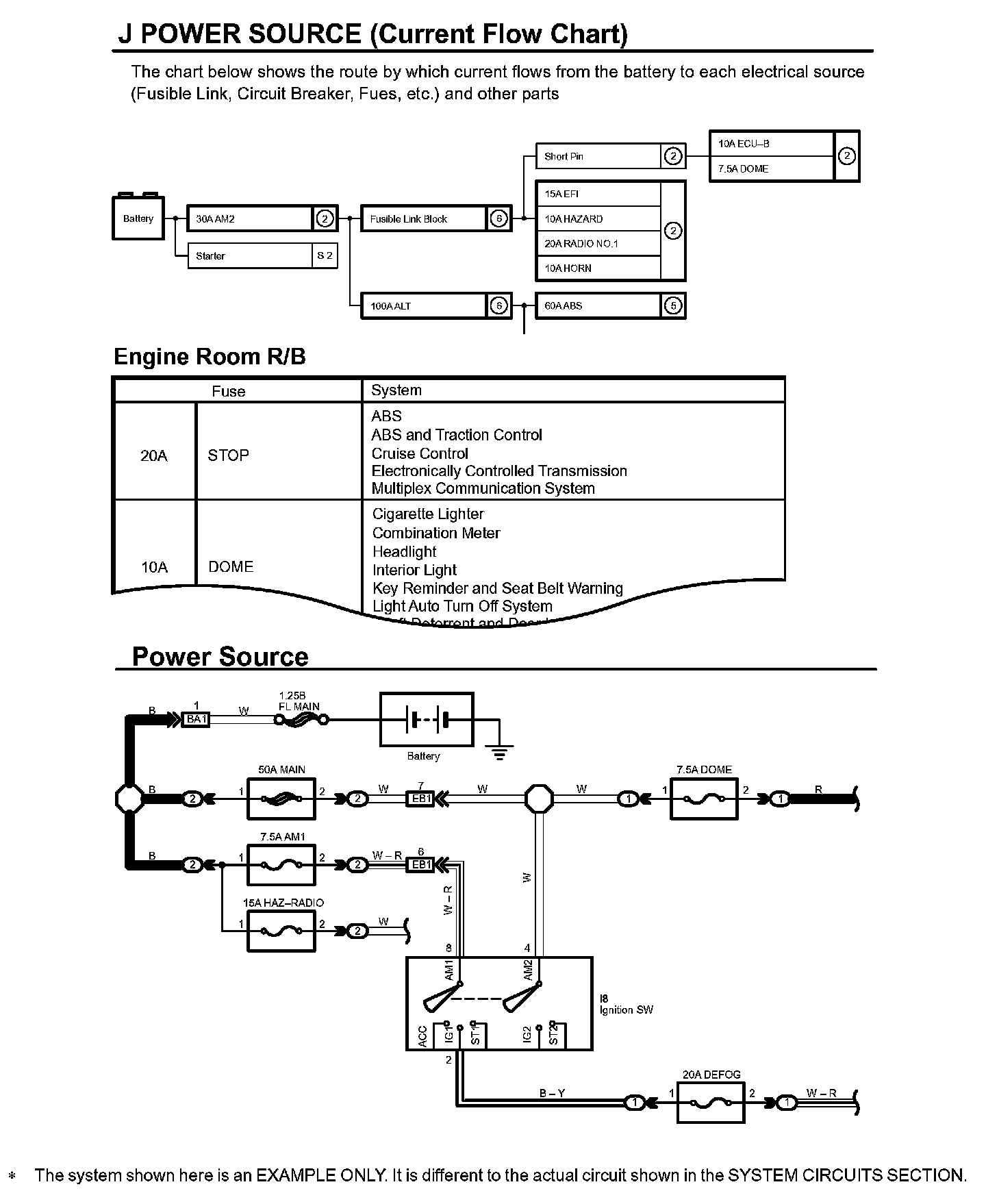 HOW TO READ POWER SOURCEThe Current Flow Chart section, describes which parts each power source (fuses, fusible links, and circuit breakers) transmits current to. In the Power Source circuit diagram, the conditions when battery power is supplied to each system are explained. Since all System Circuit diagrams start from the power source, the power source system must be fully understood.