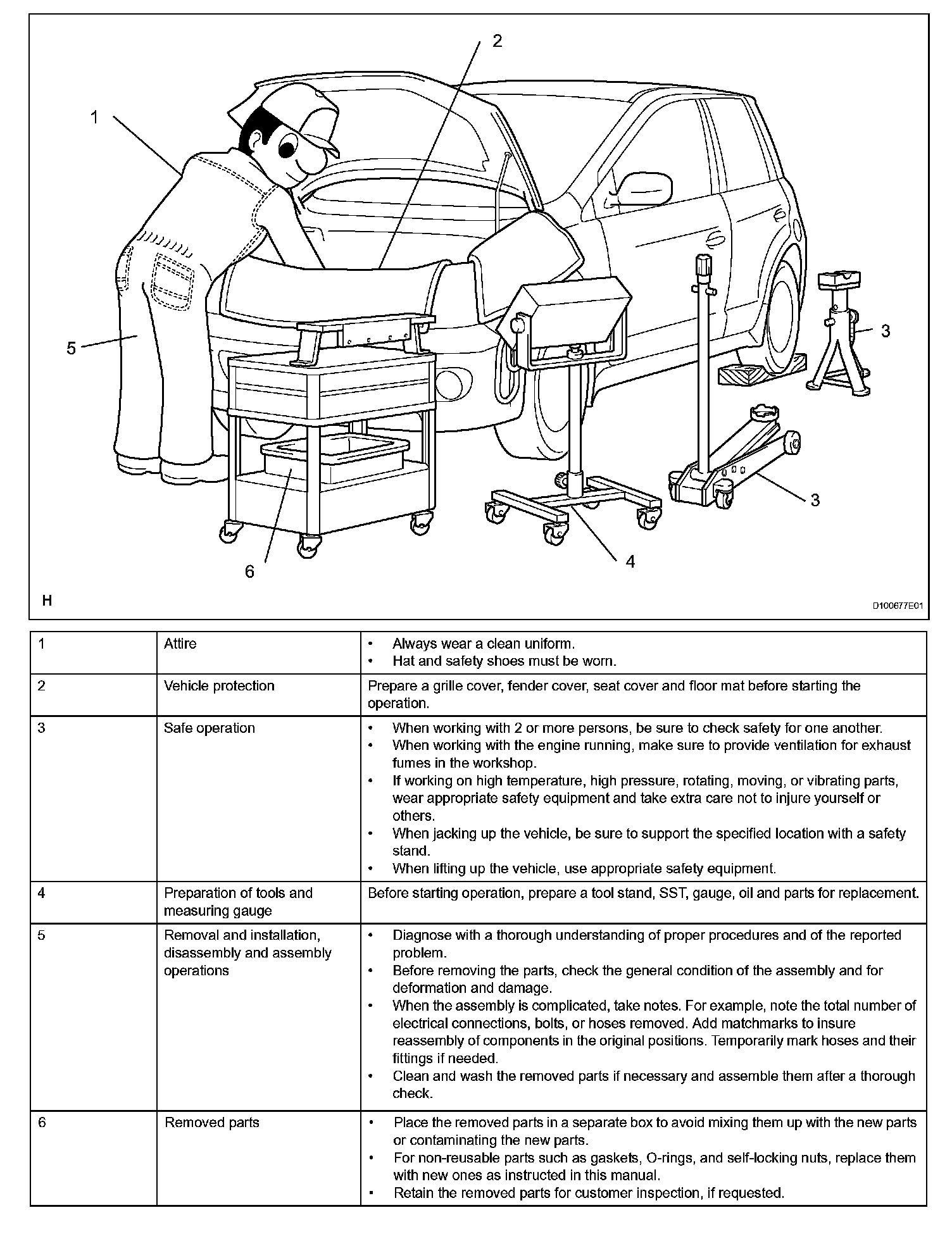 1. Care must be taken when jacking up and supporting the vehicle. Be sure to lift and support the vehicle at the proper locations.